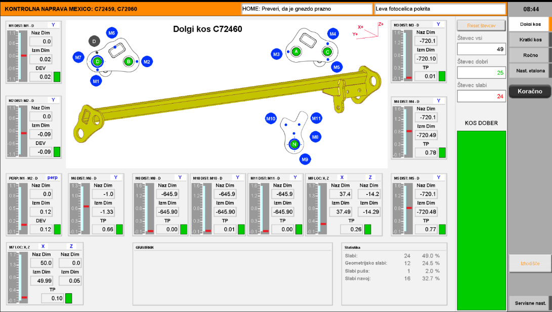 Na zvarjencu je potrebno izmeriti več dimenzijskih in geometrijskih toleranc. Posluževanje naprave je ročno – operater vloži merjenec v merilno mesto in naprava s pomočjo merilnih sond METRO in drugih senzorjev preveri tolerance in tudi prisotnost ter položaj določenih delov zvarjenca. Na velikem zaslonu je prikazan zvarjenec z rezultati vseh meritev, vse meritve izven toleranc so operaterju dobro vidne. Industrijski PC proizvajalca B&R kontrolira, da se na zvarjence, ki ustrezajo tolerancam, vgravira serijska številka. Vsi rezultati meritev se beležijo v bazo meritev, kar omogoča sledljivost zvarjencev.